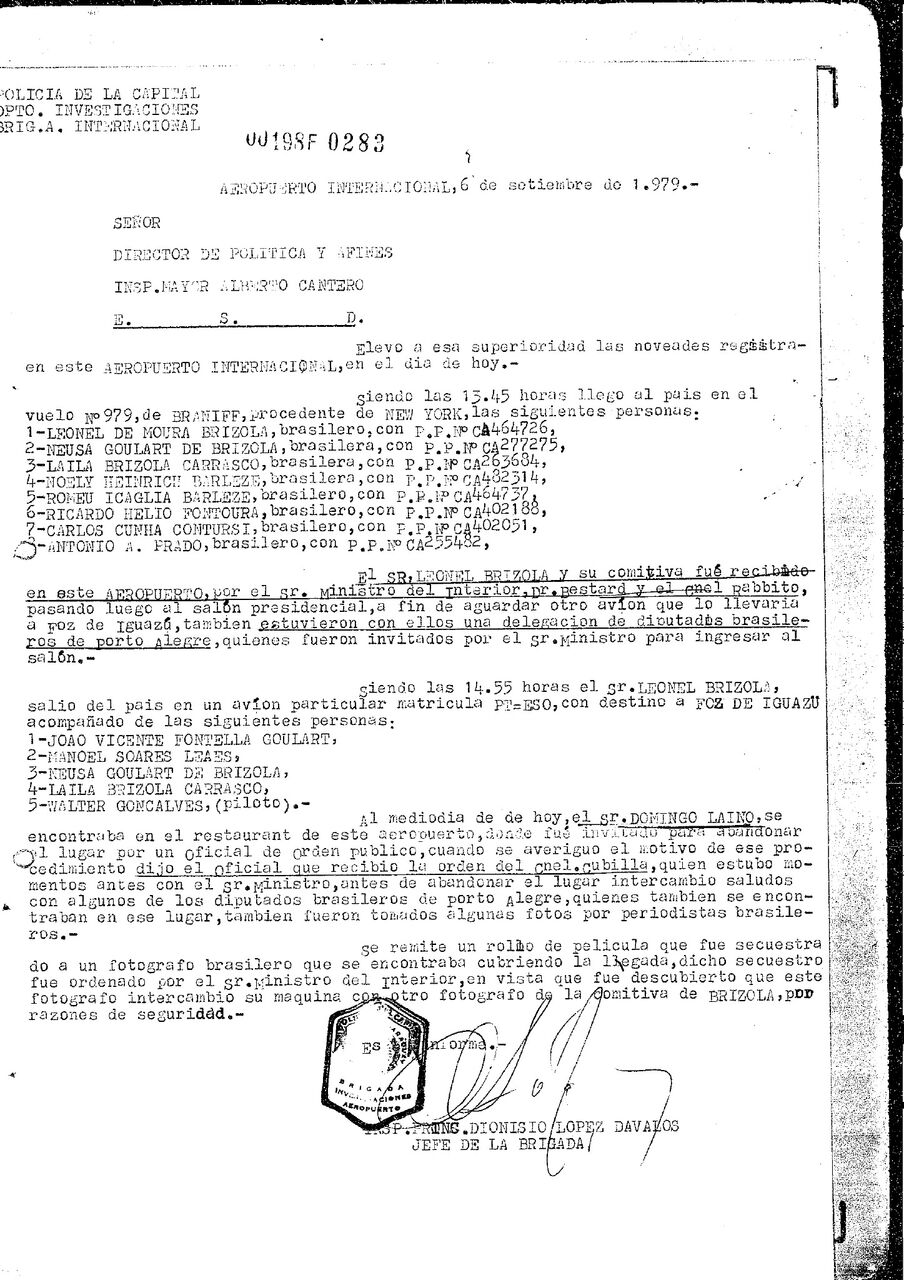 DOCUMENTO MOSTRA AÇÃO DA POLÍCIA POLÍTICA DO GENERAL STROESSNER DURANTE PASSAGEM DE BRIZOLA POR ASSUNÇÃO