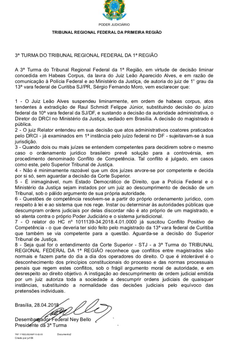 Ele se referia a recusa de Sergio Moro a cumprir Habeas Corpus de juiz do TRF-1 que suspendeu a extradição do empresário português Raul Schmidt, investigado na “lava jato”, ao Brasil. Para Moro, como a decisão foi tomada por membros do TRF-1 e ele é lotado na 4ª Região, a corte não tem jurisdição sobre suas decisões. Com o argumento, manteve a ordem de extradição do empresário. “É inimaginável, num Estado Democrático de Direito, que a Polícia Federal e o Ministério da Justiça sejam instados por um juiz ao descumprimento de decisão de um tribunal, sob o pálido argumento de sua própria autoridade”, disse Bello em nota.