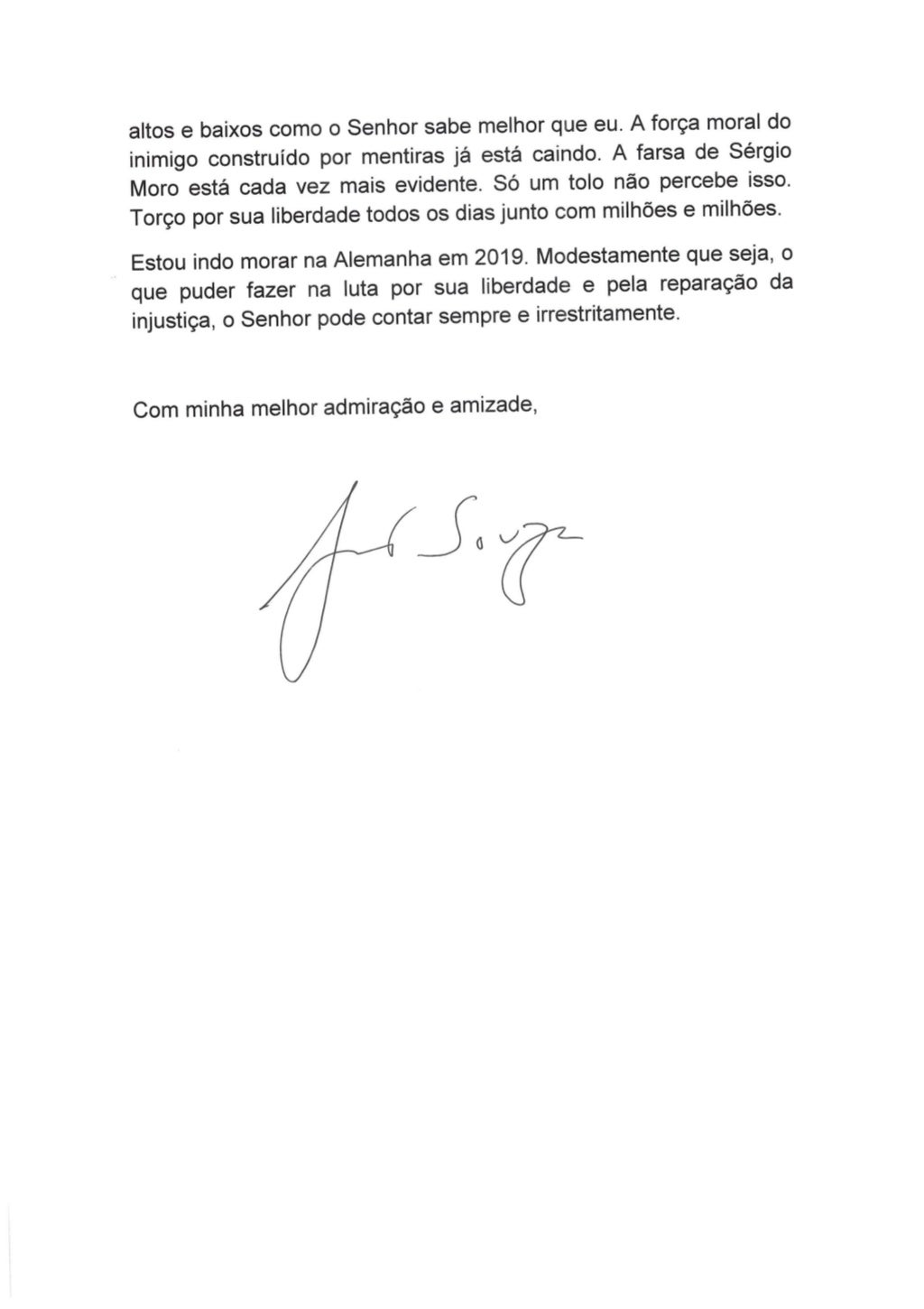 Souza destacou ainda que a perseguição judicial a Lula está cada vez mais clara e se materializa na parcialidade do agora ex-juiz Sérgio Moro. "A força moral do inimigo construída por mentiras já está caindo. A farsa de Sérgio Moro está cada vez mais evidente. Só um tolo não percebe isso", afirmou a Lula.