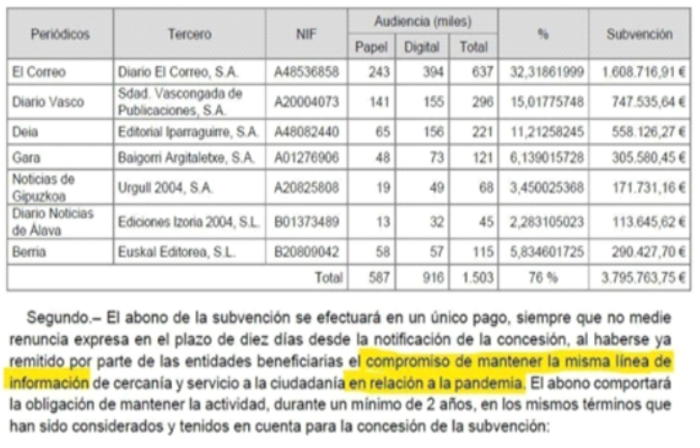 Não é só controle empresarial. O poder político faz-se cúmplice directo e suborna meios de comunicação com subvenções, com a condição de que mantenham a linha oficial em relação à pandemia, a todos, incluídos os jornais da esquerda abertzale, Gara y Berria[17].