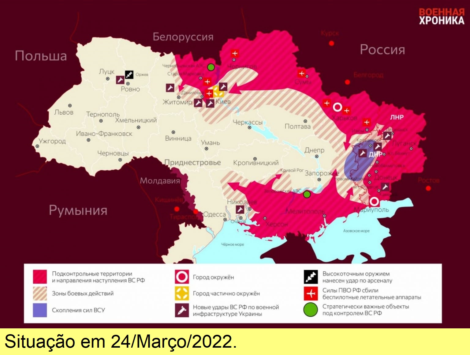 A escala e o alcance do ataque russo é notável. Eles capturaram em três semanas um território que é maior do que a massa terrestre do Reino Unido. Em seguida, procederam a ataques direccionados a cidades e instalações militares importantes. Não vimos um único exemplo de um regimento ou unidade com a dimensão de brigada ucraniana atacar e derrotar uma unidade russa comparável. Em vez disso, os russos dividiram o exército ucraniano em fragmentos e cortaram as suas linhas de comunicação. Os russos estão a consolidar o seu controlo de Mariupol e asseguraram todas as abordagens no Mar Negro. A Ucrânia está agora cortada no Sul e no Norte.