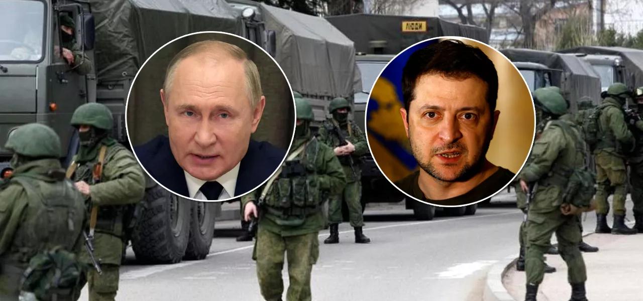 Presidentes Vladimir Putin (Rússia) e Volodymyr Zelensky (Ucrânia) mais tropas russas em solo ucraniano ao fundo (Foto: Reuters)