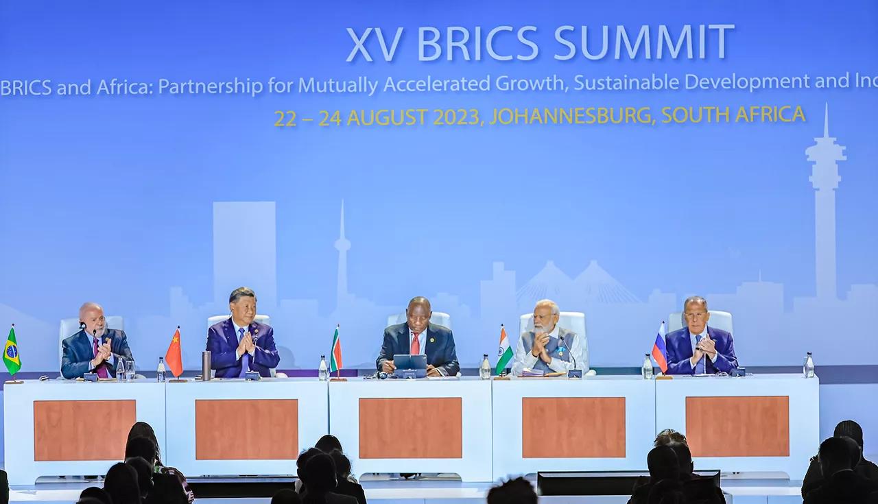 Da esq. para a dir.: presidentes Lula, Xi Jinping, Cyril Ramaphosa, o primeiro-ministro da Índia, Narendra Modi, e o ministro das Relações Exteriores da Rússia, Sergey Lavrov (Foto: Ricardo Stuckert/PR)