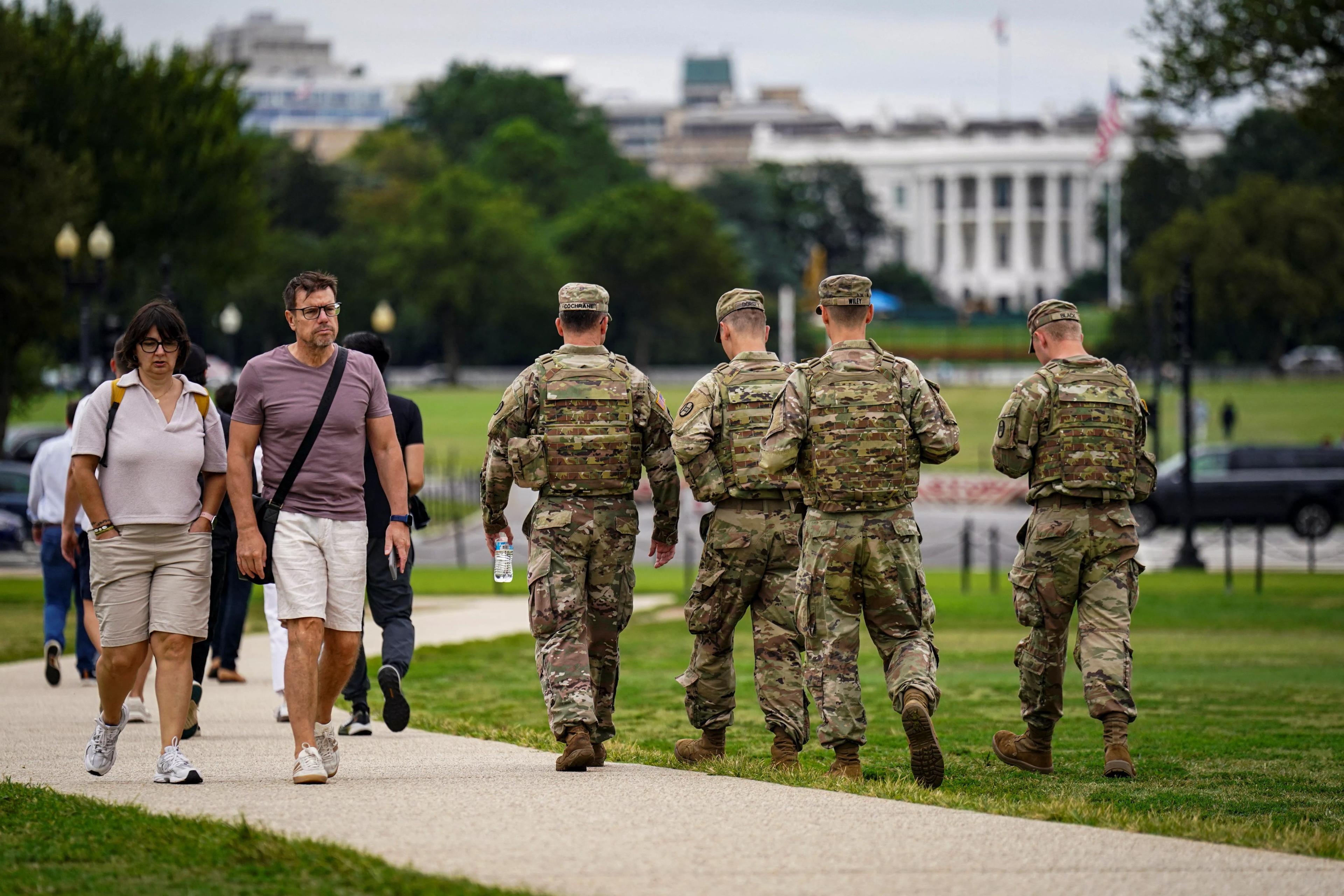Membros da Guarda Nacional caminham próximo à Casa Branca, no National Mall, em Washington, D.C., Estados Unidos - 21/08/2025 (Foto: REUTERS/Al Drago)