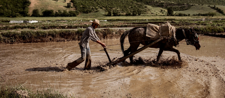 Um agricultor arando seu arrozal em Golestan, Irã. Foto de Hossein Fatemi/Panos Pictures