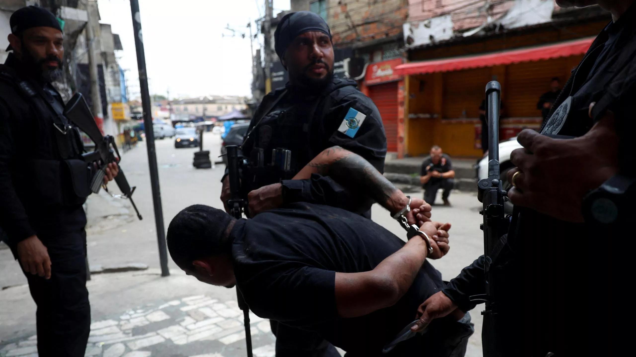 Um homem é detido por agentes da polícia durante uma operação policial contra o tráfico de droga na favela da Penha, no Rio de Janeiro - 28 de outubro de 2025 (Foto: REUTERS/Aline Massuca)