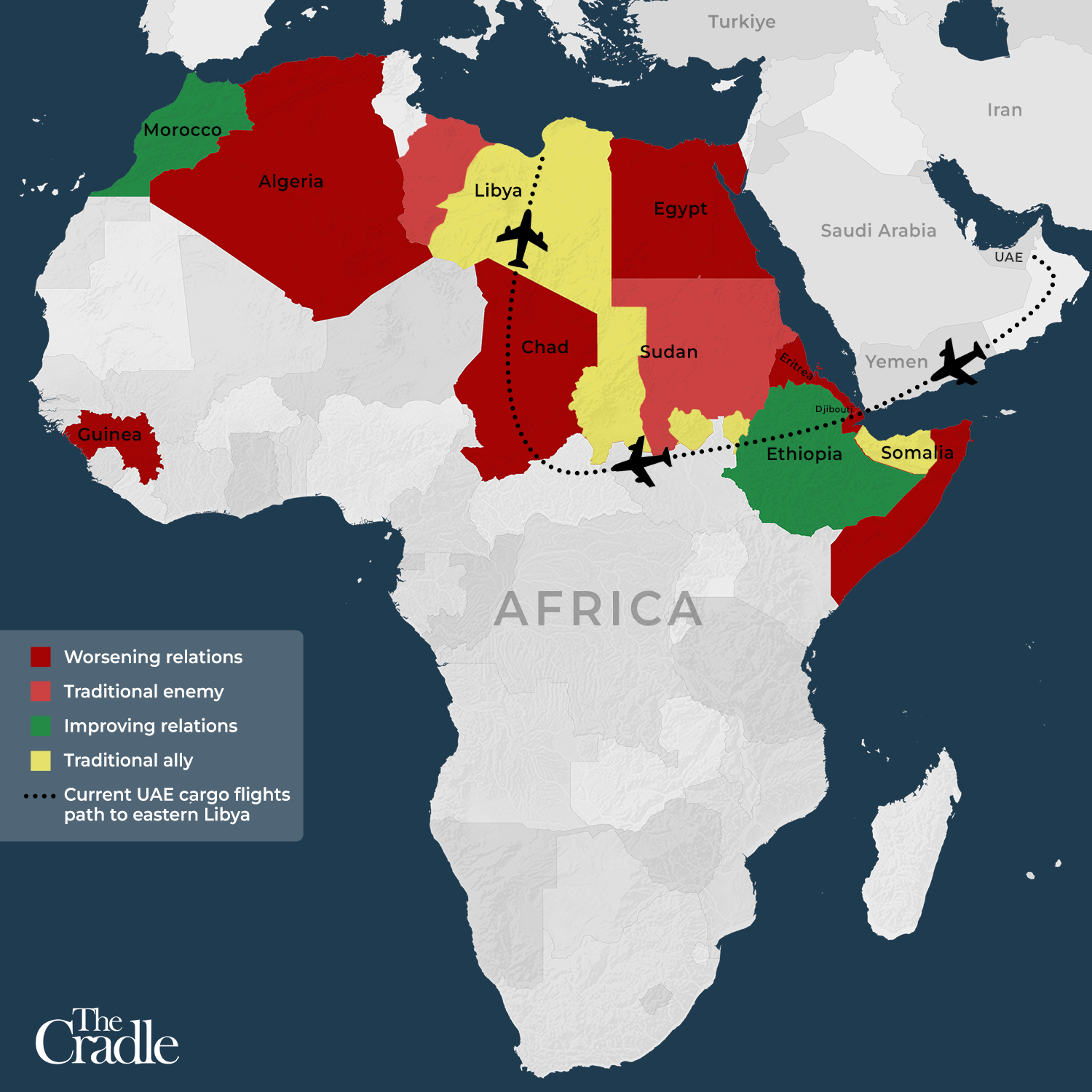 Para sustentar as Forças de Apoio Rápido (RSF), os Emirados Árabes Unidos contaram com escalas na Somália/Somalilândia (Berbera e Bosaso), no Chade (Amdjarass) e na Líbia (Kufra), países controlados pelo Exército Nacional Líbio (LNA), apoiado pelos Emirados Árabes Unidos.