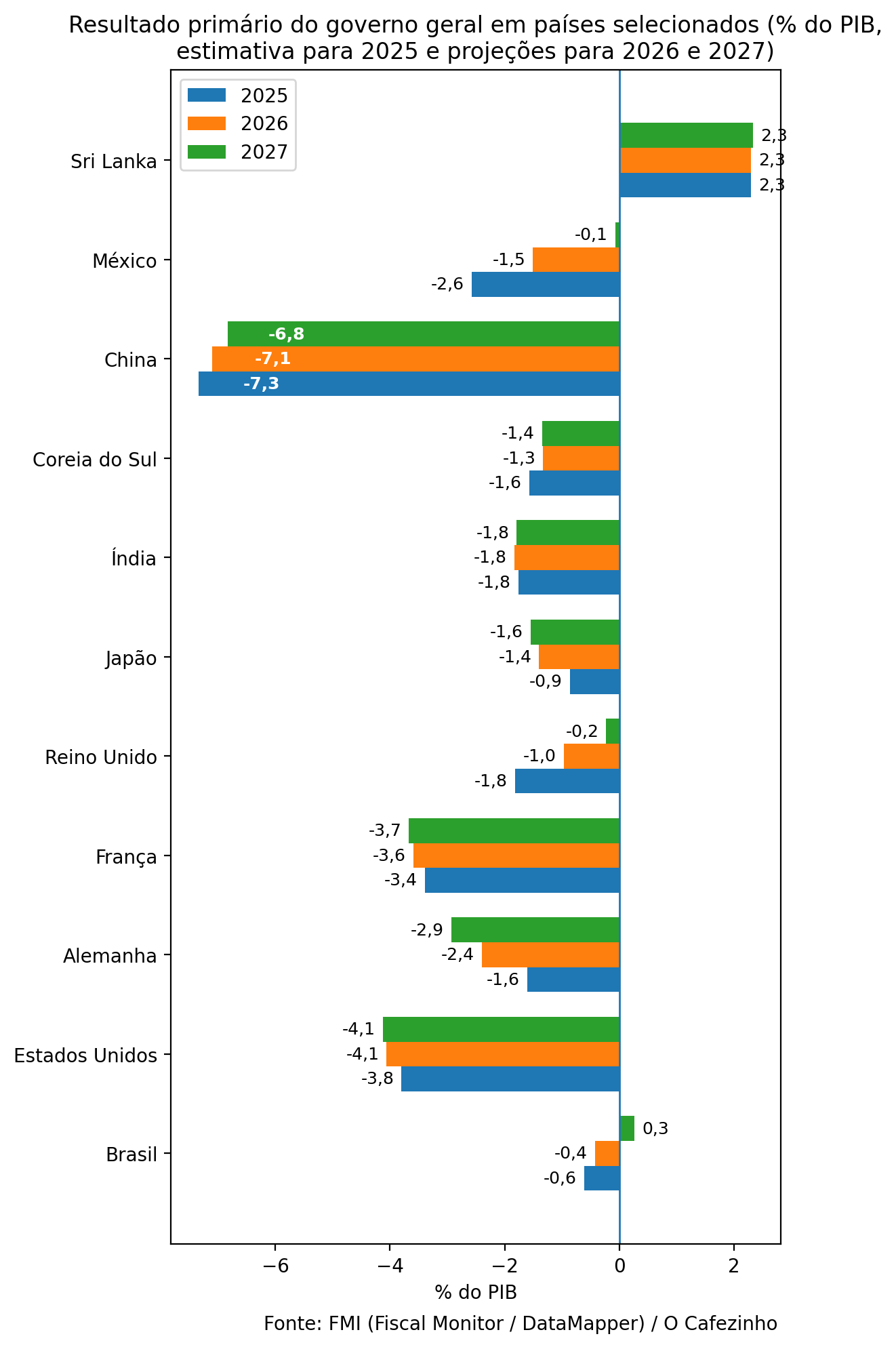 Mesmo sob uma metodologia mais rigorosa do que a usada nas regras fiscais domésticas, o país figura entre aqueles com menor desequilíbrio primário. Mais importante: o próprio FMI projeta melhora gradual e constante dos números fiscais brasileiros, com superávits a partir de 2027 — na contramão da maioria das grandes economias, que devem continuar registrando déficits por muito mais tempo.