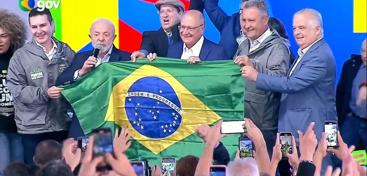 O presidente Luiz Inácio Lula da Silva, com o vice-presidente Geraldo Alckmin, seguram uma bandeira do Brasil, com ministros e outras figuras políticas, em Osasco, SP - 25/07/2025 (Foto: Divulgação/PR)