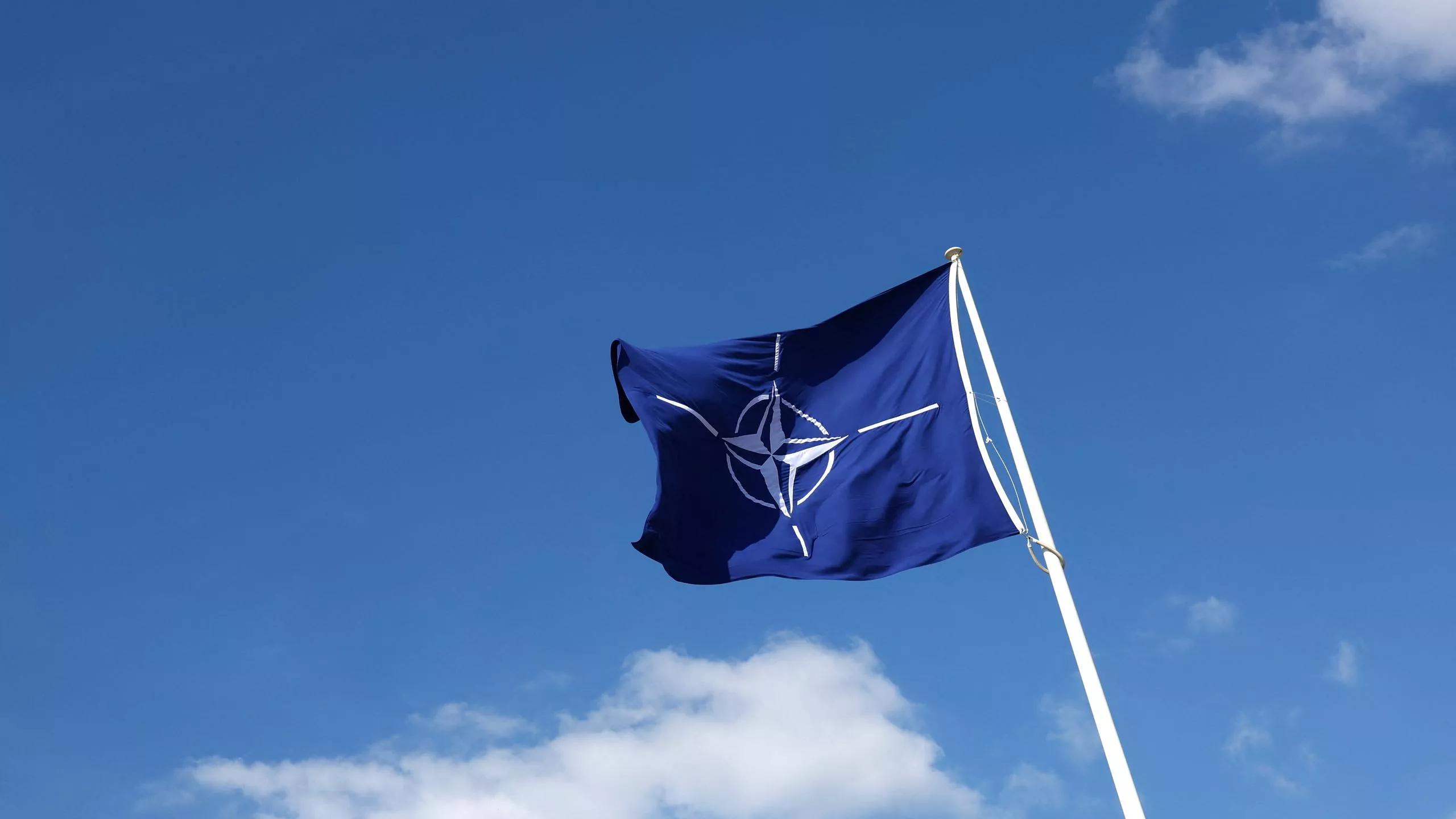 Bandeira da Otan na sede da aliança militar em Bruxelas, Bélgica - 02/04/2025 (Foto: REUTERS/Yves Herman)